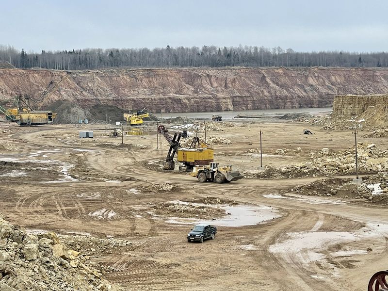 У вялізным кар’еры, плошча якога перавышае 450 гектараў, а глыбіня распрацоўкі карысных выкапняў складае 35–36 метраў, габарыты БЕЛАЗаў здаюцца куды меншымі, чым зблізку. Ды яшчэ ў параўнанні з горным экскаватарам, аб’ём каўша якога складае 10 кубаметраў. Некалькі яго «жмень» — і 30-тонны кузаў запоўнены. Дарэчы, як сцвярджаюць спецыялісты, разведаных запасаў карысных выкапняў, а іх больш за 686 млн тон, тут хопіць на 150–200 гадоў работы прадпрыемства.