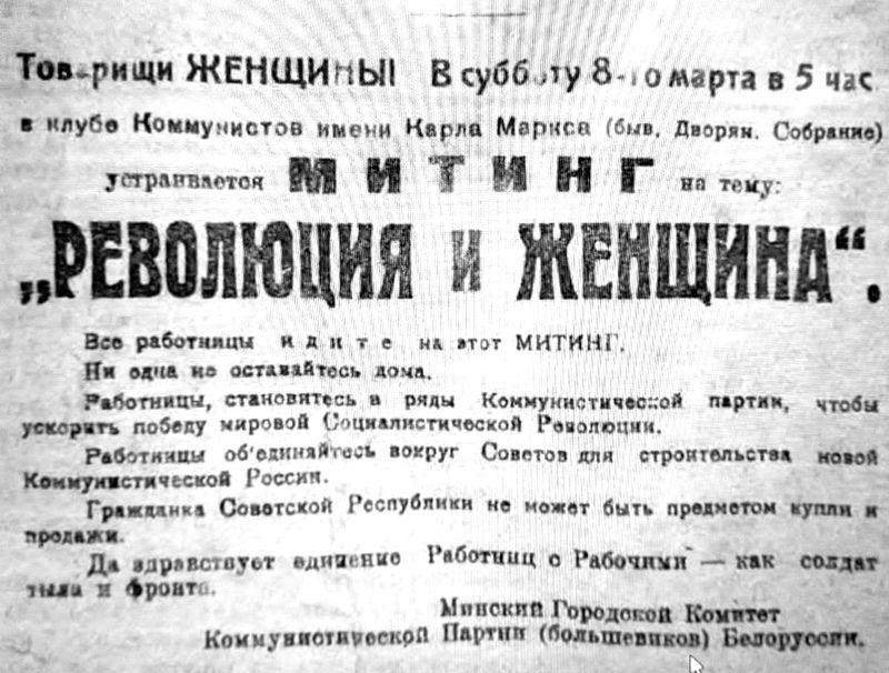 Першыя беларускія камуністкі спрабавалі далучыць жанчын і да партыйнай работы. Праводзіліся мітынгі-канцэрты для жанчын, напрыклад, да 8 Сакавіка. Праўда, як сведчаць публікацыі, падпісаныя аўтарам «Камуністка», жанчын было цяжка сабраць нават на «нарады актыўных работніц», і яны пакуль не адчулі сваю ролю ў будаўніцтве новага жыцця.