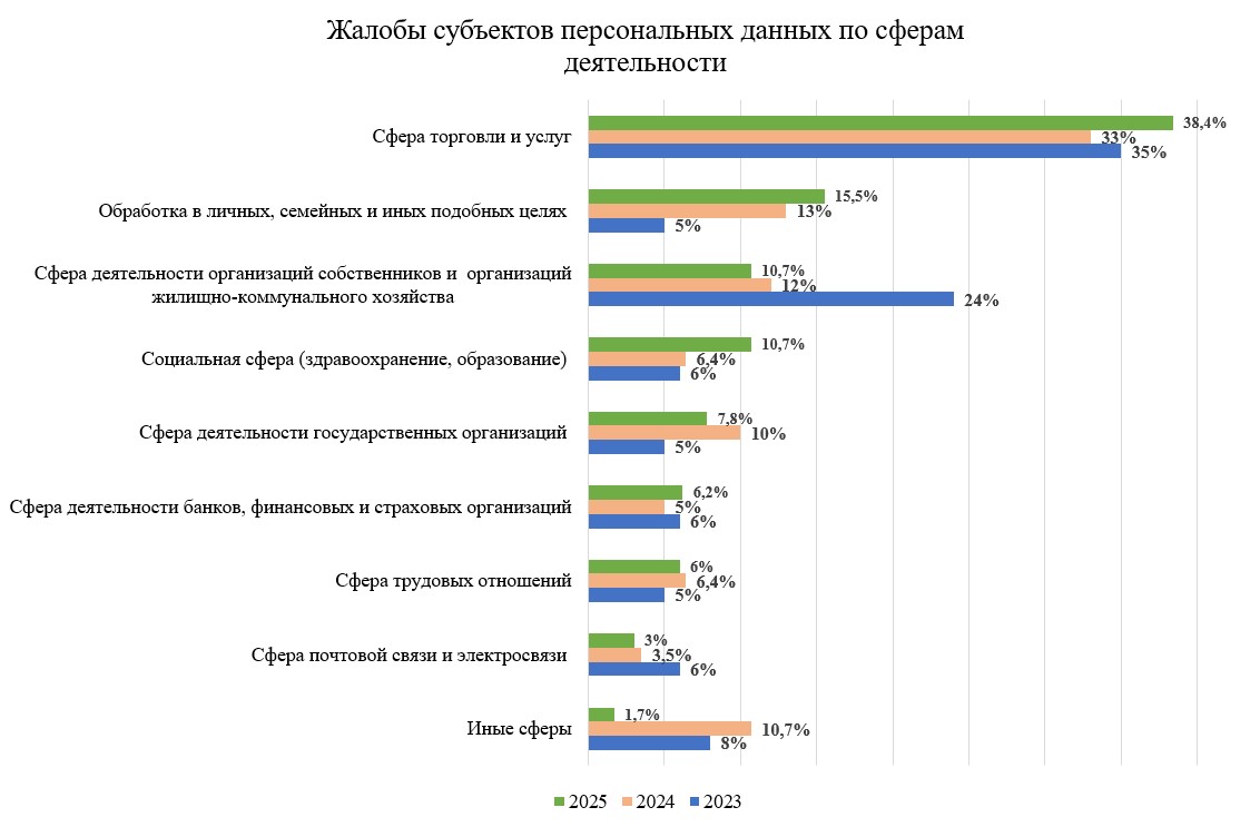 Наибольшее количество жалоб касалось вопросов обработки персональных данных в сфере торговли и услуг (торговые сети, интернет-магазины и т.п.). В сравнении с 2024 годом их количество от общего числа жалоб увеличилось с 33 до 38,4%.