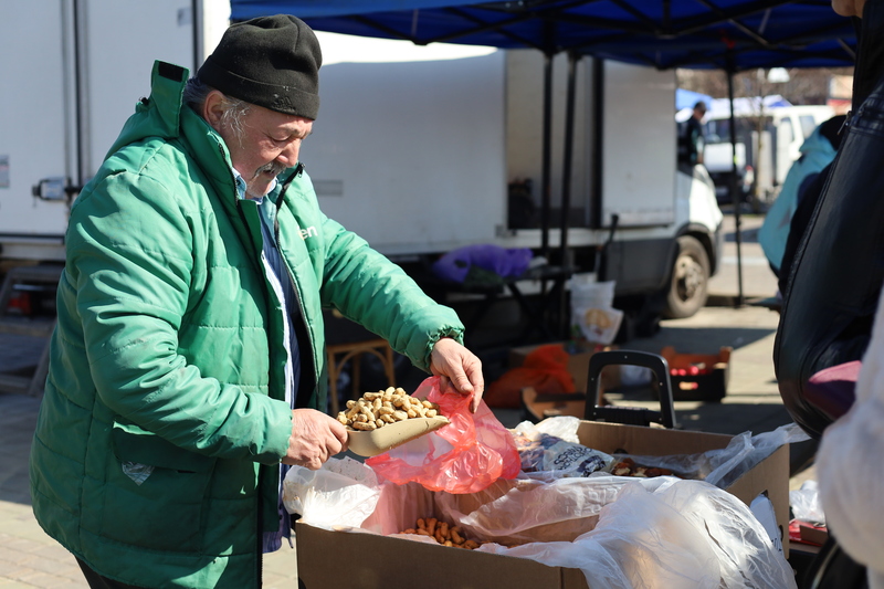 Вялікая чарга перад прылаўкам з арэхавымі наборамі і сухафруктамі. Прадавец аддае абсмажаны арахіс па 9 рублёў за кіло. Кампотная сумесь сухафруктаў абыдзецца крыху танней, усяго па 6 рублёў.