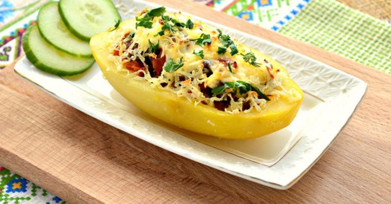 Бульбу запячы цалкам, разрэзаўшы напалам і выняўшы асяродак. Фарш змяшаць са здробненым часнаком, соллю і перцам, абсмажыць, затым запоўніць атрыманыя поласці ў бульбе. Зверху паліць смятанай і пасыпаць надзёртым сырам. Запякаць дадаткова 10-15 хвілін да залацістай скарыначкі.