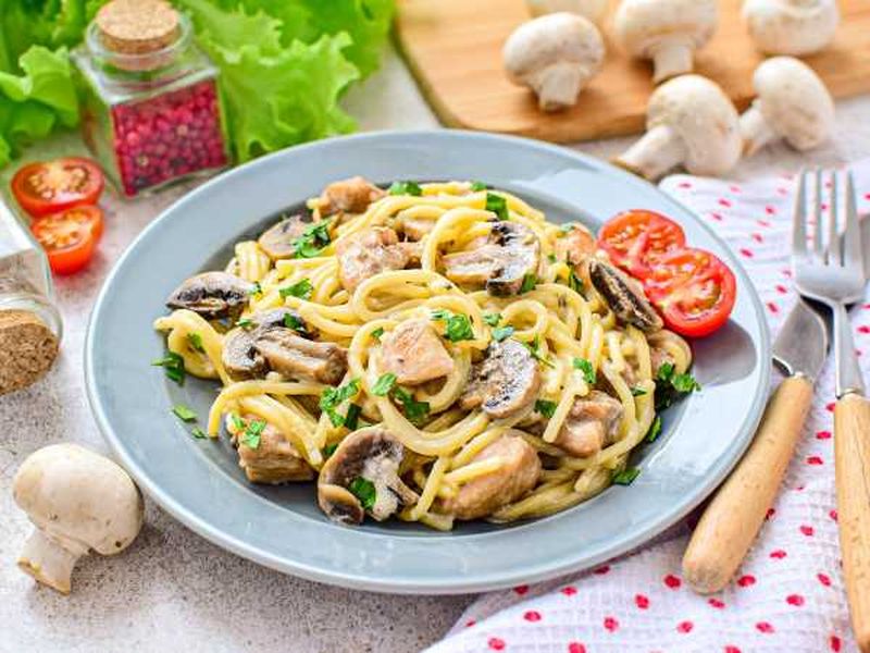 Макарона з курыцай і грыбамі