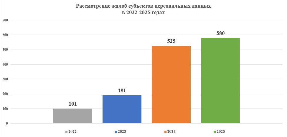 Граждане активно реализовывали свое право на подачу в Центр жалоб на операторов, которые нарушают их права при обработке личной информации. В сравнении с 2024 годом количество жалоб увеличилось на 10,5% (с 525 до 580).