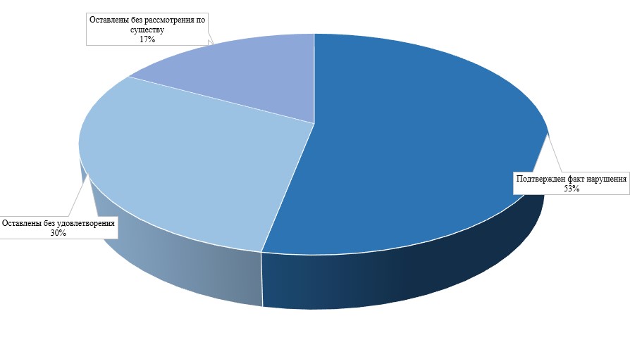 Из общего количества рассмотренных жалоб 53% признаны обоснованными полностью либо частично, 30% — оставлены без удовлетворения, 17% — оставлены без рассмотрения по существу.