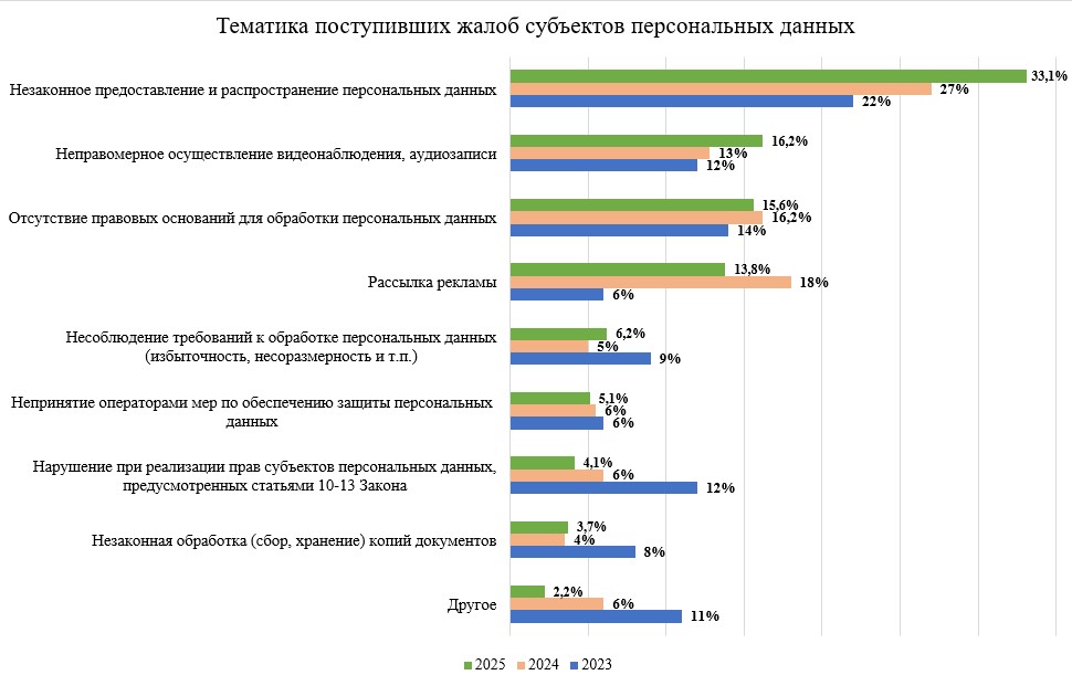 В 2025 году наблюдался рост жалоб по вопросам правомерности предоставления персональных данных третьим лицам, распространения личной информации, в том числе в сети Интернет (мессенджерах, социальных сетях) (с 27 до 33,1%), осуществления видеонаблюдения и аудиозаписи (с 13 до 16,2%), несоблюдения общих требований к обработке персональных данных, в том числе в части требований о соразмерности и недопущении избыточной обработки персональных данных (с 5 до 6,2%).